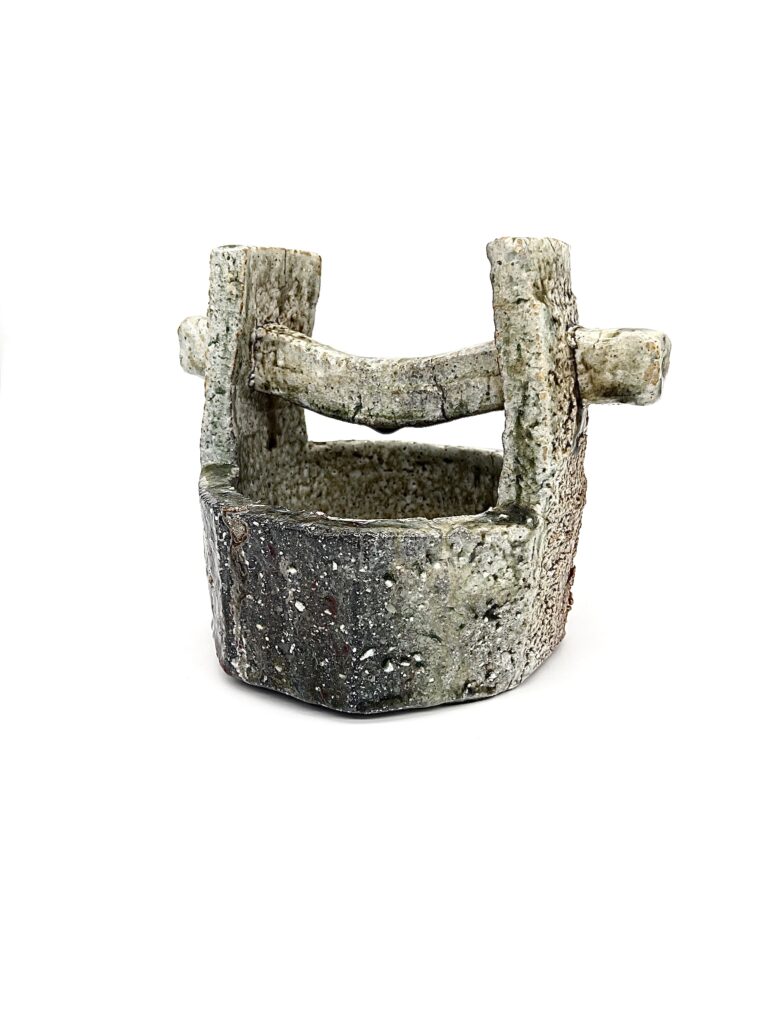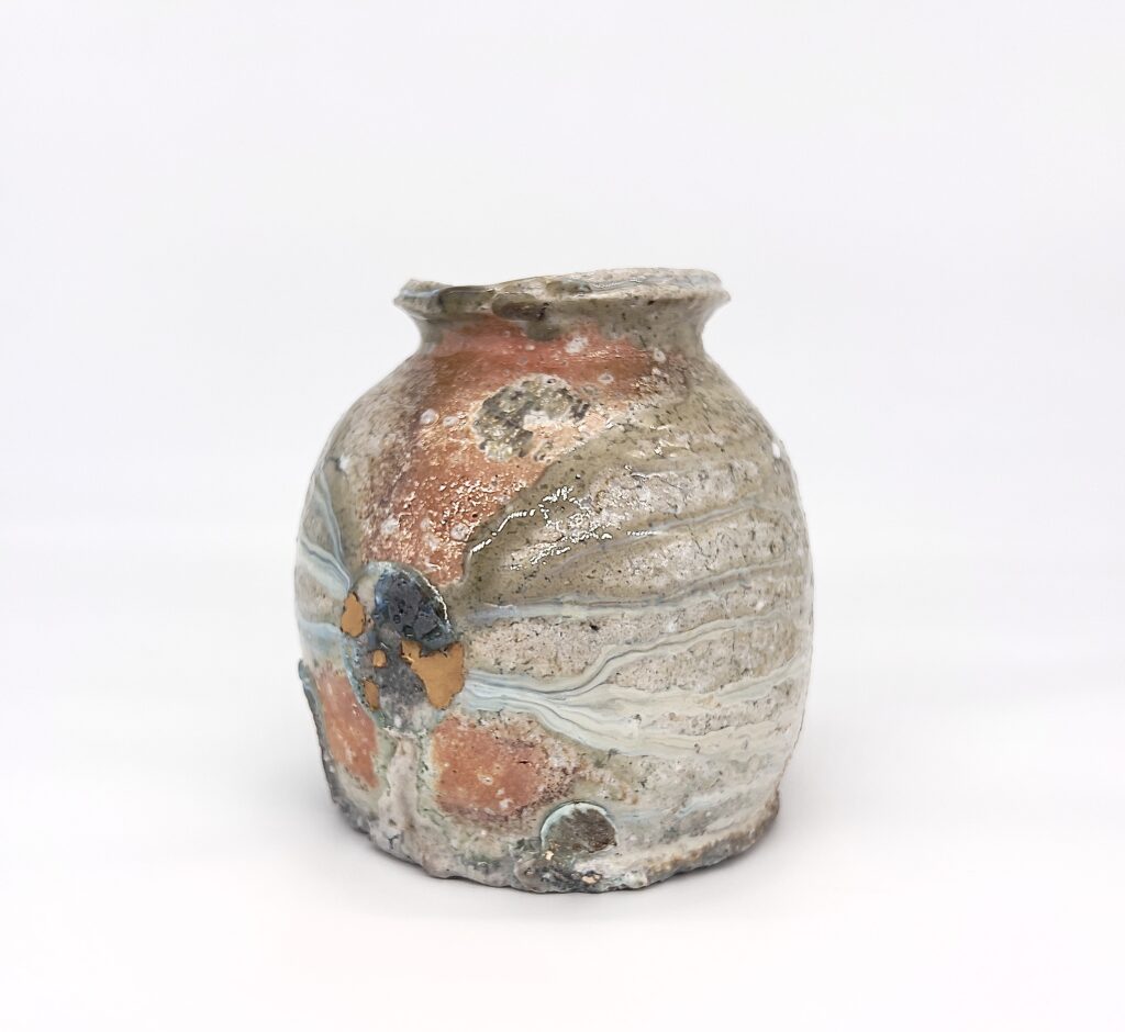 本日は信楽窯変の作品を紹介します。穴窯(薪窯)で焼成する場合、焚き口に近いところには様々な窯変が起こります。火の質=還元炎、酸化炎と炊いた薪の灰が高温の中で溶け出して模様を作り出します。それらは出来るだけ焼き上がりを意識して成形した作品を窯詰めしていきますが、おおかた予想に反してその模様は現れます。窯の調子により思わぬ模様が現れる事がありますが、此れを窯変と呼んでいる様です。もともと古信楽は釉薬(器の表面に色を施すくすり)は使わず、成形して乾燥した器を穴窯で焼きあげる焼き締めと言われる技法で焼成します。