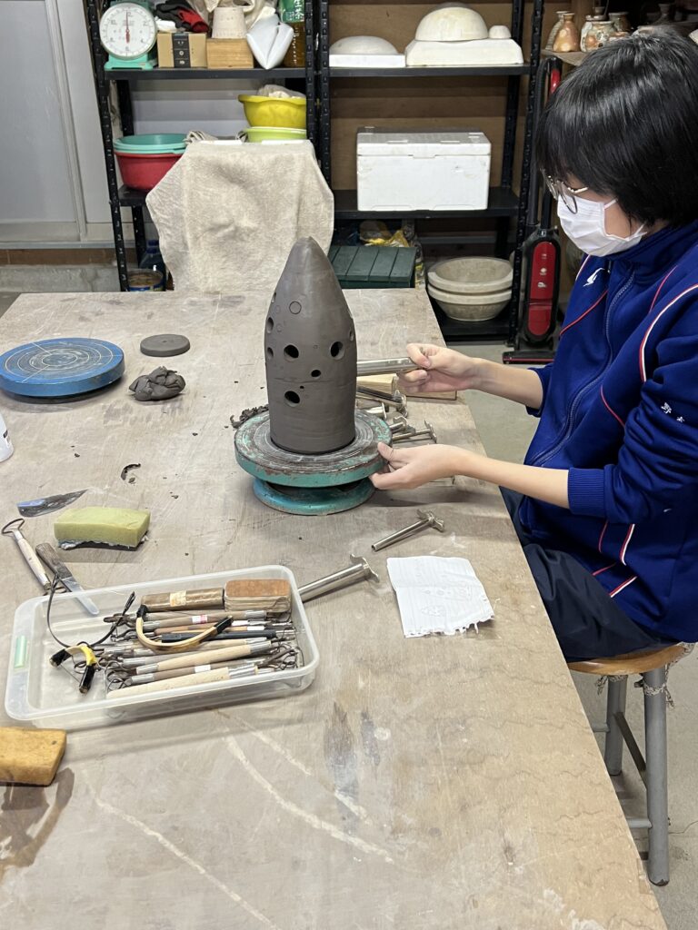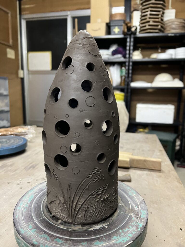 本日は(陶灯)ランプシェードの成形の仕上げ。生徒さんのイメージ通り先週殆ど帽子状の形を作り今回はその仕上げです。まず丸い底をくり抜き、全体を削る。その後灯窓を幾つも開けていき、最後にドベで下方の装飾を施した後、竹篦で稲穂の絵を彫り完成です。後は乾燥させ素焼きを待ちます。