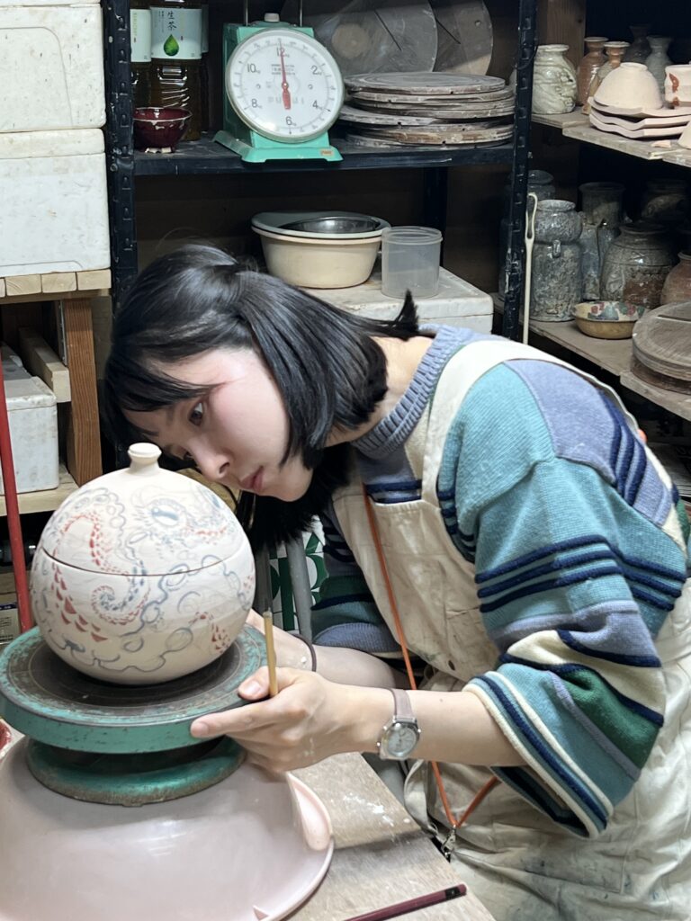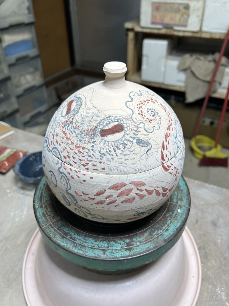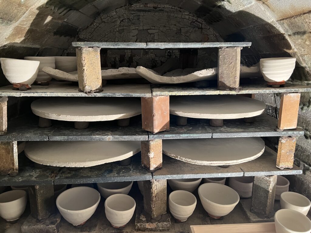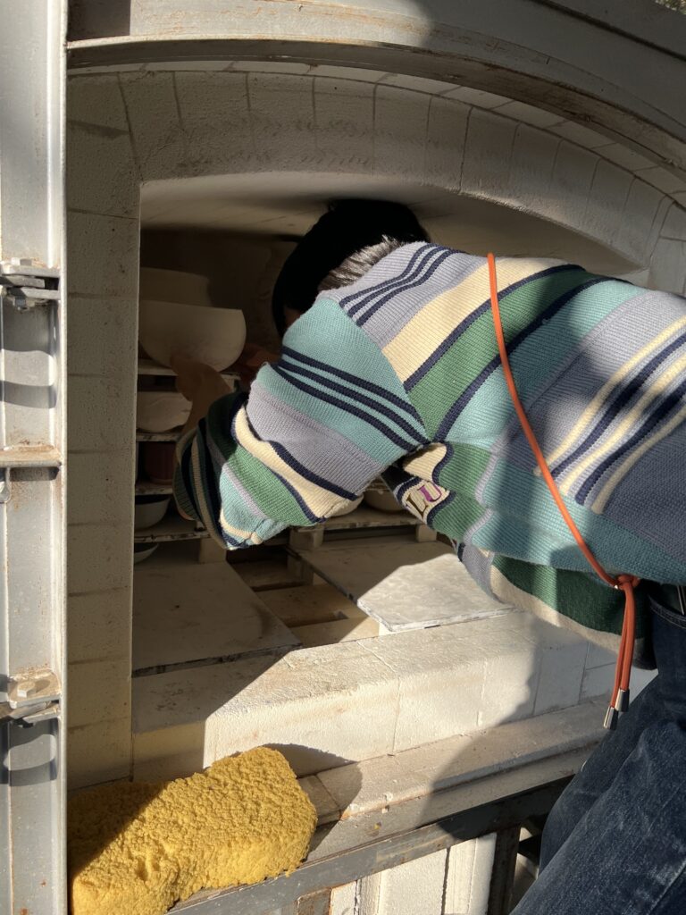 先日ガス窯の素焼きを終了して、本日は陶芸教室の生徒が施釉(以前に木灰、石灰を中心に透明釉を作っておいたものを使う)と蓋物の絵付けを行なっている。彼女は銅版画家であるので、非常に絵が上手い‼️取り組みも一心不乱で、素晴らしい集中力である。来週もう一度様々な施釉と絵付けを行う予定です。ガス窯一杯に陶芸教室の生徒の作品が施釉が終われば本焼きが待っています。