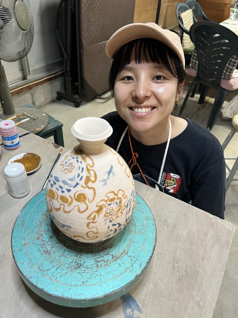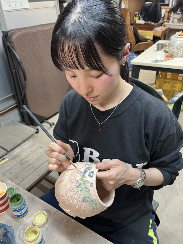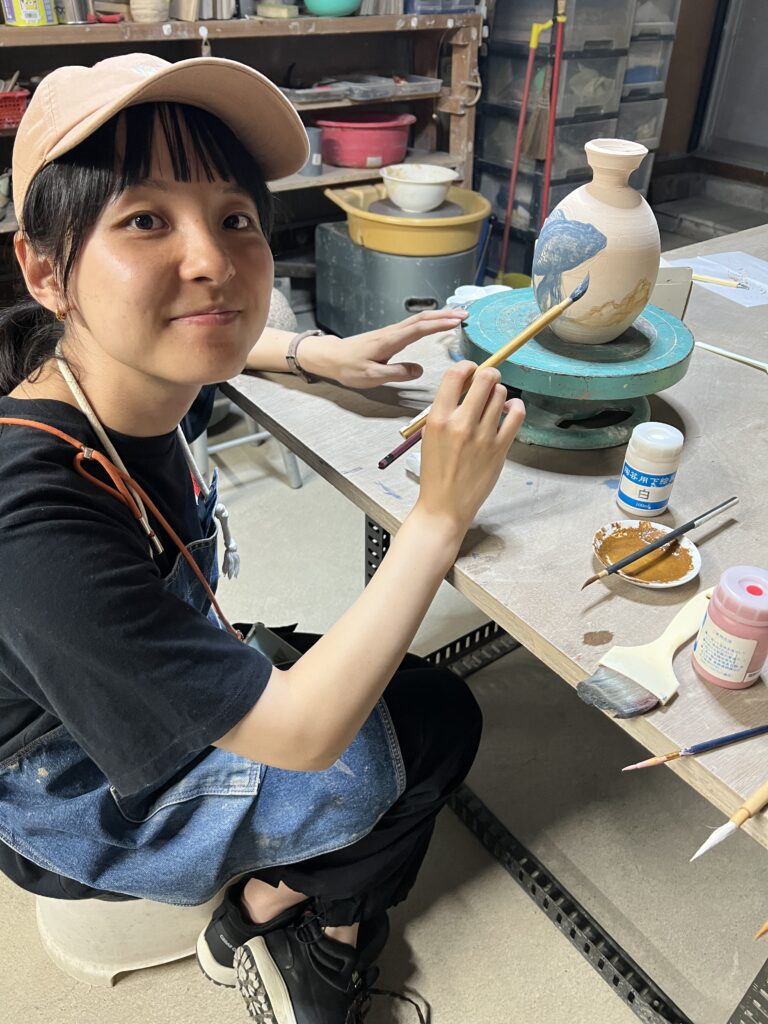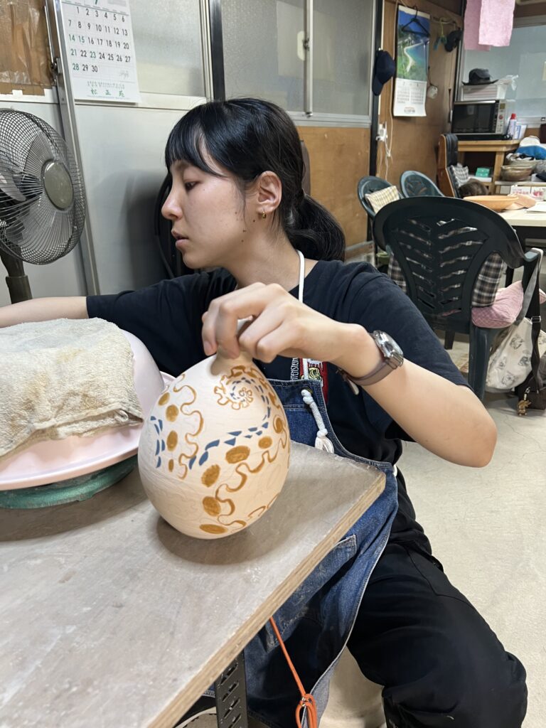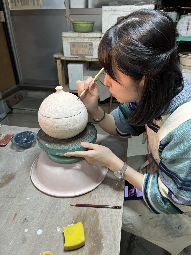 先日ガス窯の素焼きを終了して、本日は陶芸教室の生徒が施釉(以前に木灰、石灰を中心に透明釉を作っておいたものを使う)と蓋物の絵付けを行なっている。彼女は銅版画家であるので、非常に絵が上手い‼️取り組みも一心不乱で、素晴らしい集中力である。来週もう一度様々な施釉と絵付けを行う予定です。ガス窯一杯に陶芸教室の生徒の作品が施釉が終われば本焼きが待っています。