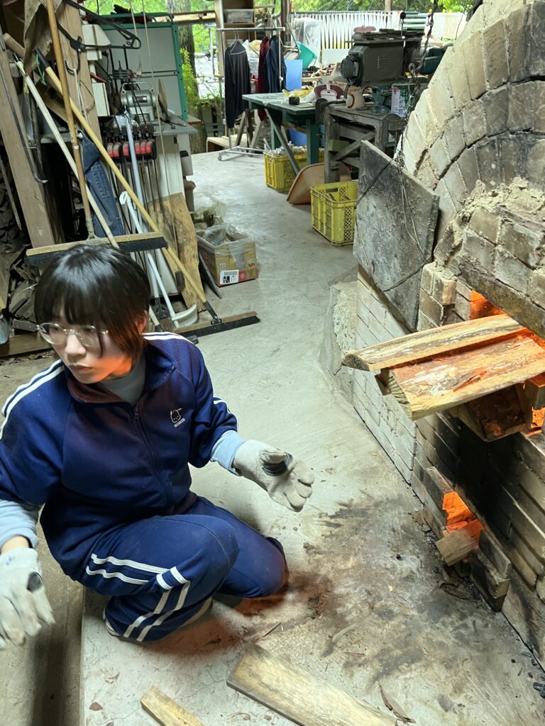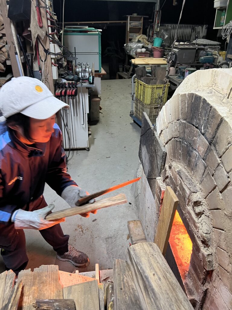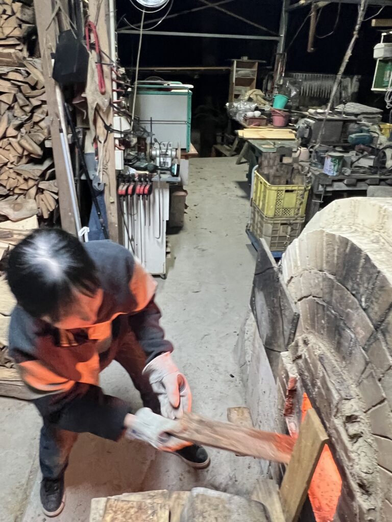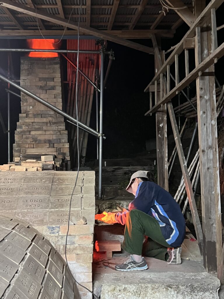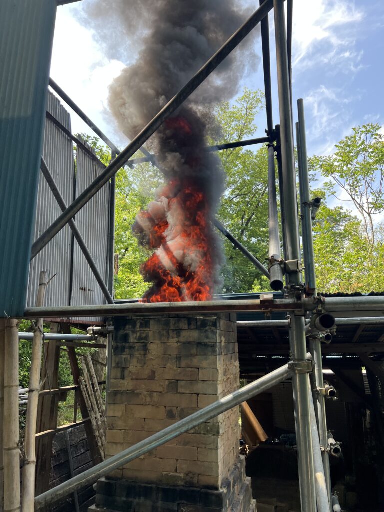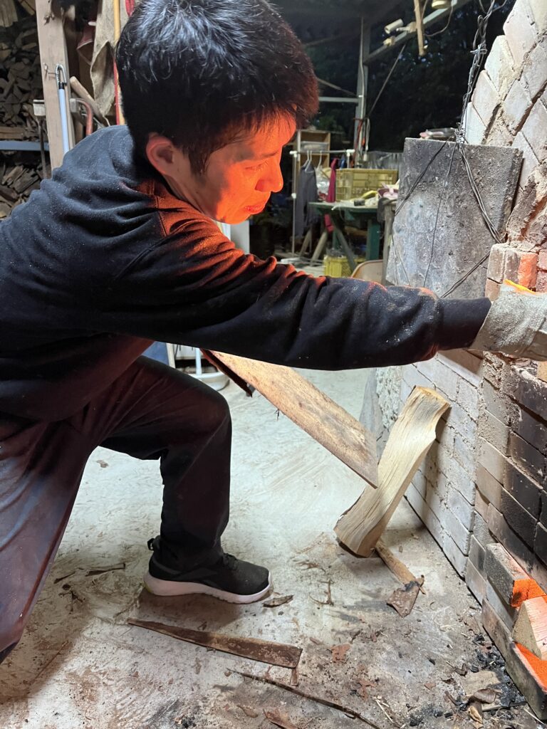 今回の窯焚きは順調に進んでいます。現在まで約4日と2時間(98時間)程です。窯焚き体験の陶芸教室の生徒の皆さんよく頑張っています。その様子を写真などでご報告させて頂きますます。今回若い生徒と一緒に80歳と言う高齢の生徒もおります。向上心旺盛で疲れをものともとせず頑張って作業に取り組んでいます。今回の窯焚きでそれなりの経験をして次回に備えています。窯の中の温度は現在段階1290°c前後、Maxで1283°cです。後1日半程頑張り、終了したいと考えていますが、予定通り行くかは窯次第です。この間、現在は大雨、又大変な作業もありながらも皆さん楽しんでいます。