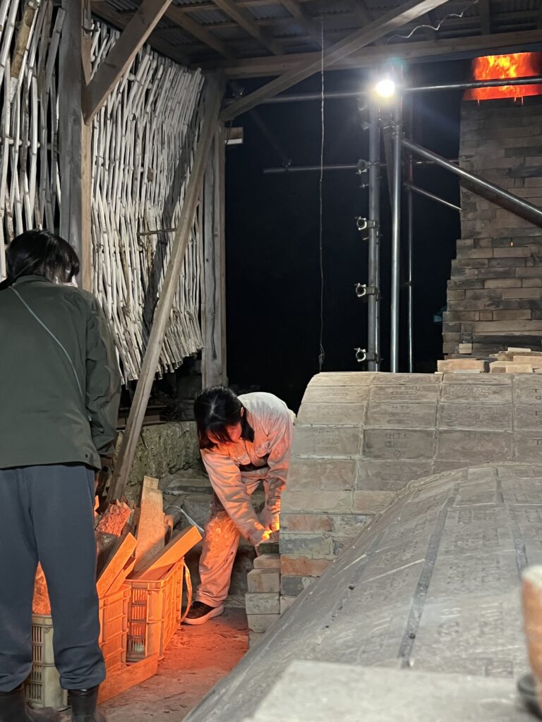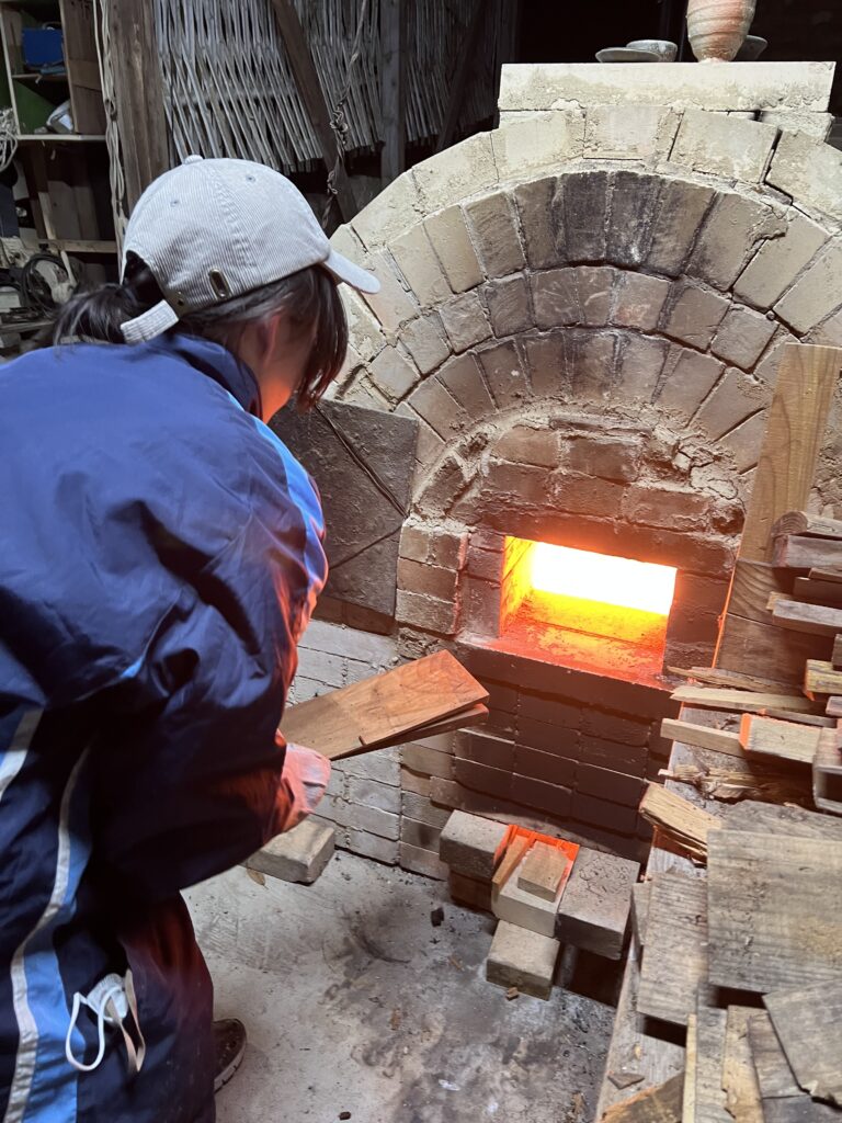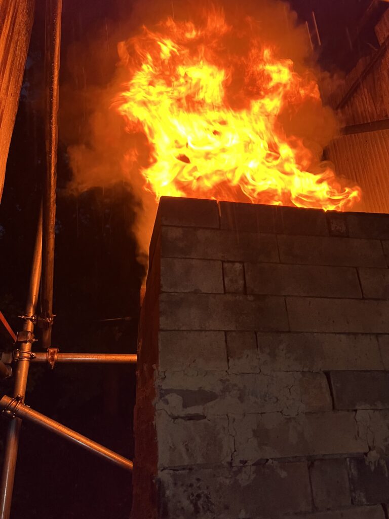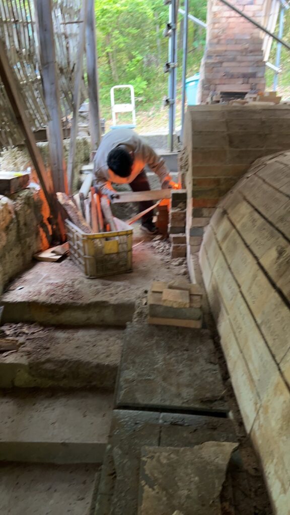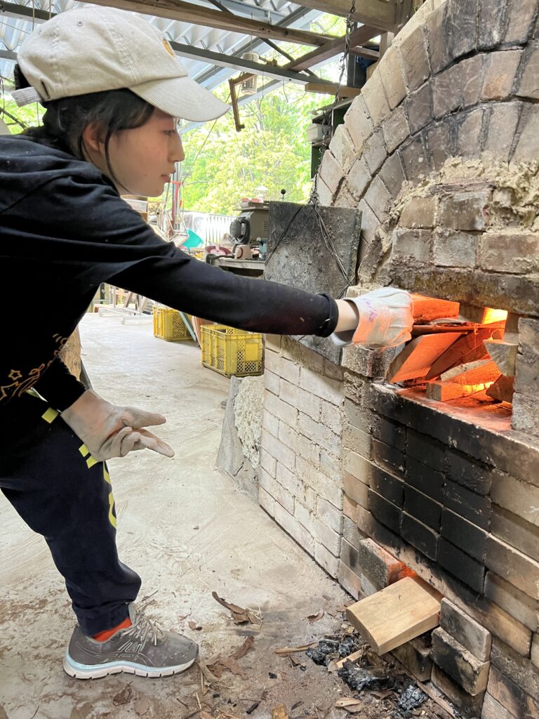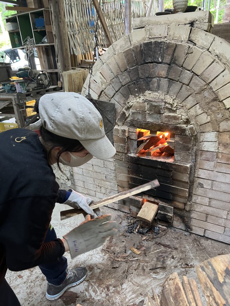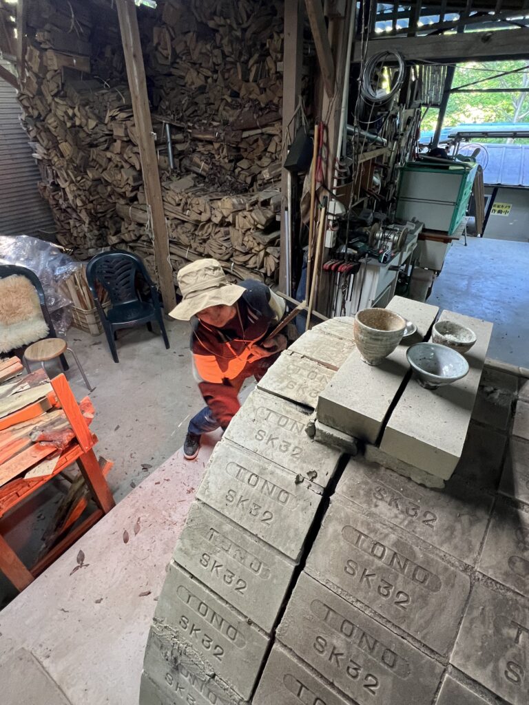 今回の窯焚きは順調に進んでいます。現在まで約4日と2時間(98時間)程です。窯焚き体験の陶芸教室の生徒の皆さんよく頑張っています。その様子を写真などでご報告させて頂きますます。今回若い生徒と一緒に80歳と言う高齢の生徒もおります。向上心旺盛で疲れをものともとせず頑張って作業に取り組んでいます。今回の窯焚きでそれなりの経験をして次回に備えています。窯の中の温度は現在段階1290°c前後、Maxで1283°cです。後1日半程頑張り、終了したいと考えていますが、予定通り行くかは窯次第です。この間、現在は大雨、又大変な作業もありながらも皆さん楽しんでいます。