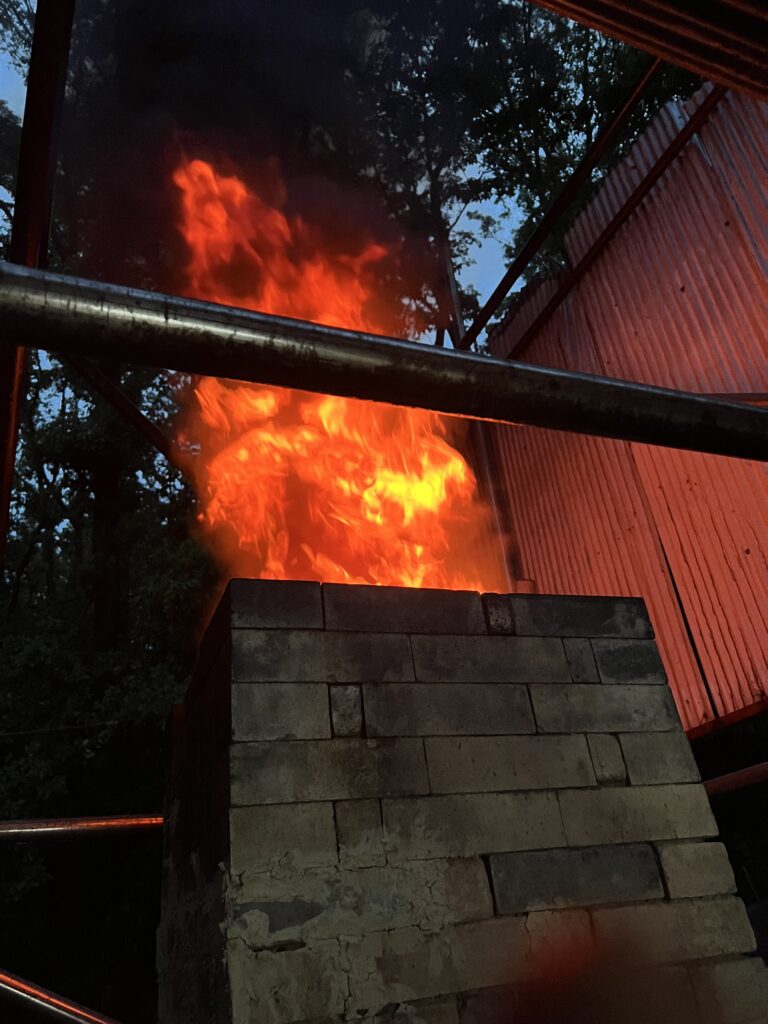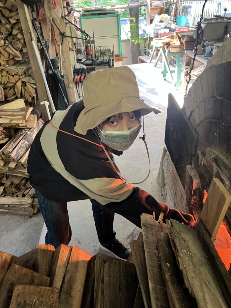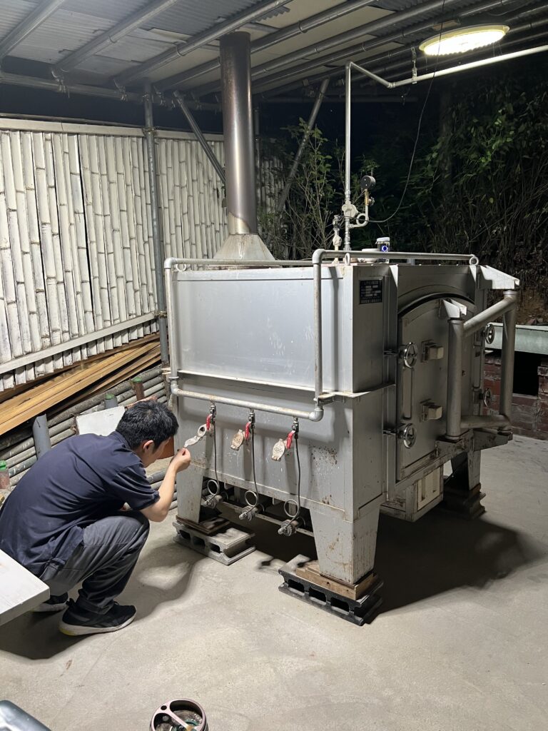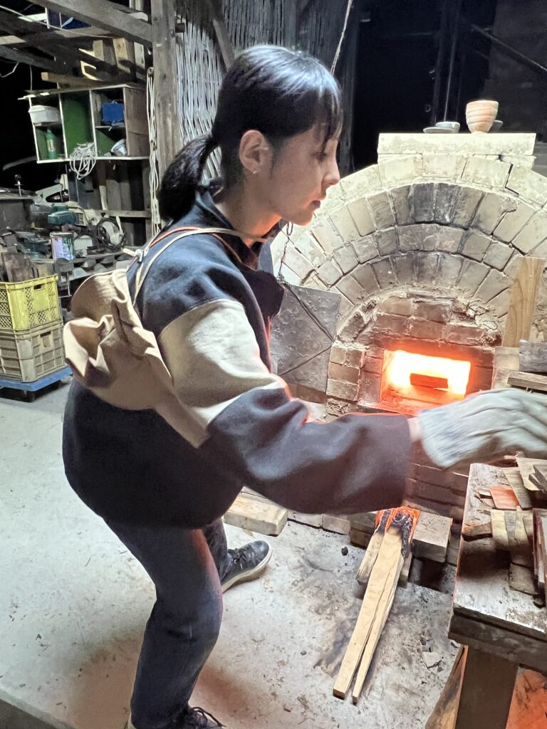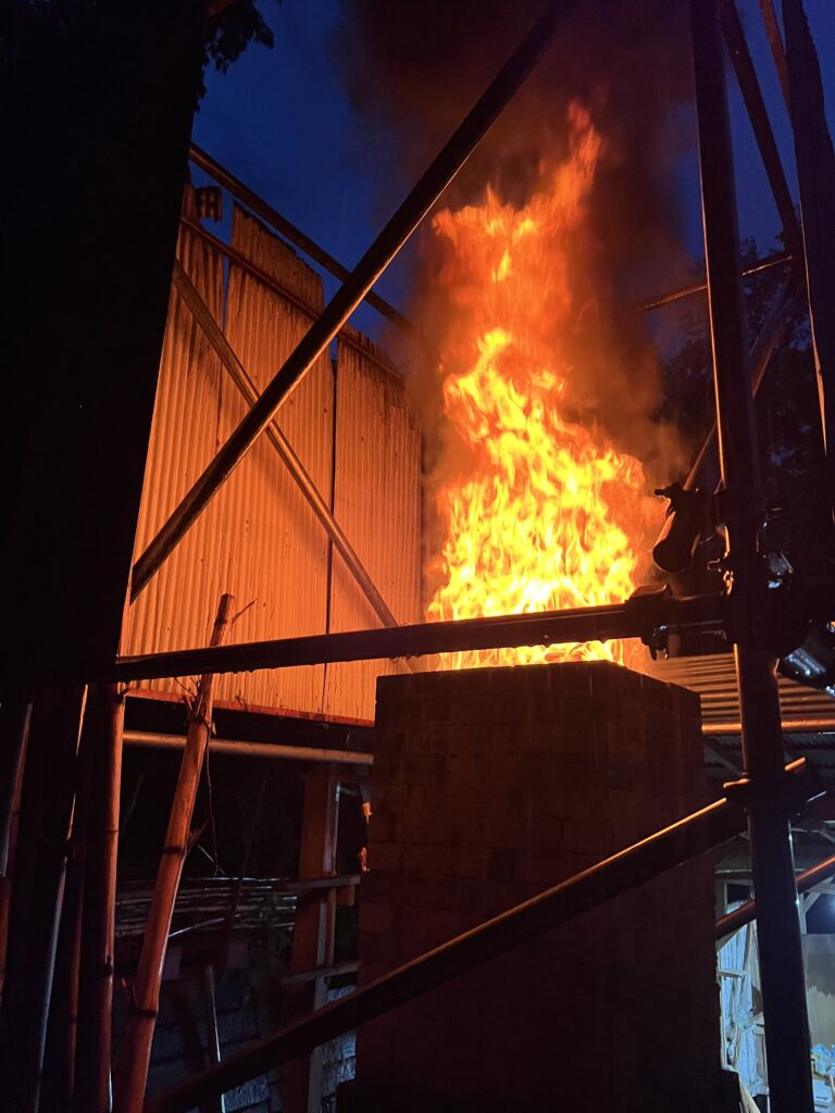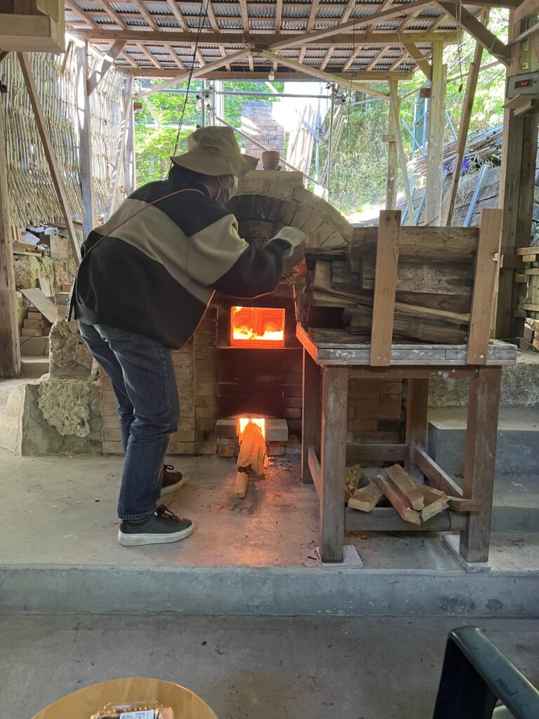 今回の窯焚きは順調に進んでいます。現在まで約4日と2時間(98時間)程です。窯焚き体験の陶芸教室の生徒の皆さんよく頑張っています。その様子を写真などでご報告させて頂きますます。今回若い生徒と一緒に80歳と言う高齢の生徒もおります。向上心旺盛で疲れをものともとせず頑張って作業に取り組んでいます。今回の窯焚きでそれなりの経験をして次回に備えています。窯の中の温度は現在段階1290°c前後、Maxで1283°cです。後1日半程頑張り、終了したいと考えていますが、予定通り行くかは窯次第です。この間、現在は大雨、又大変な作業もありながらも皆さん楽しんでいます。