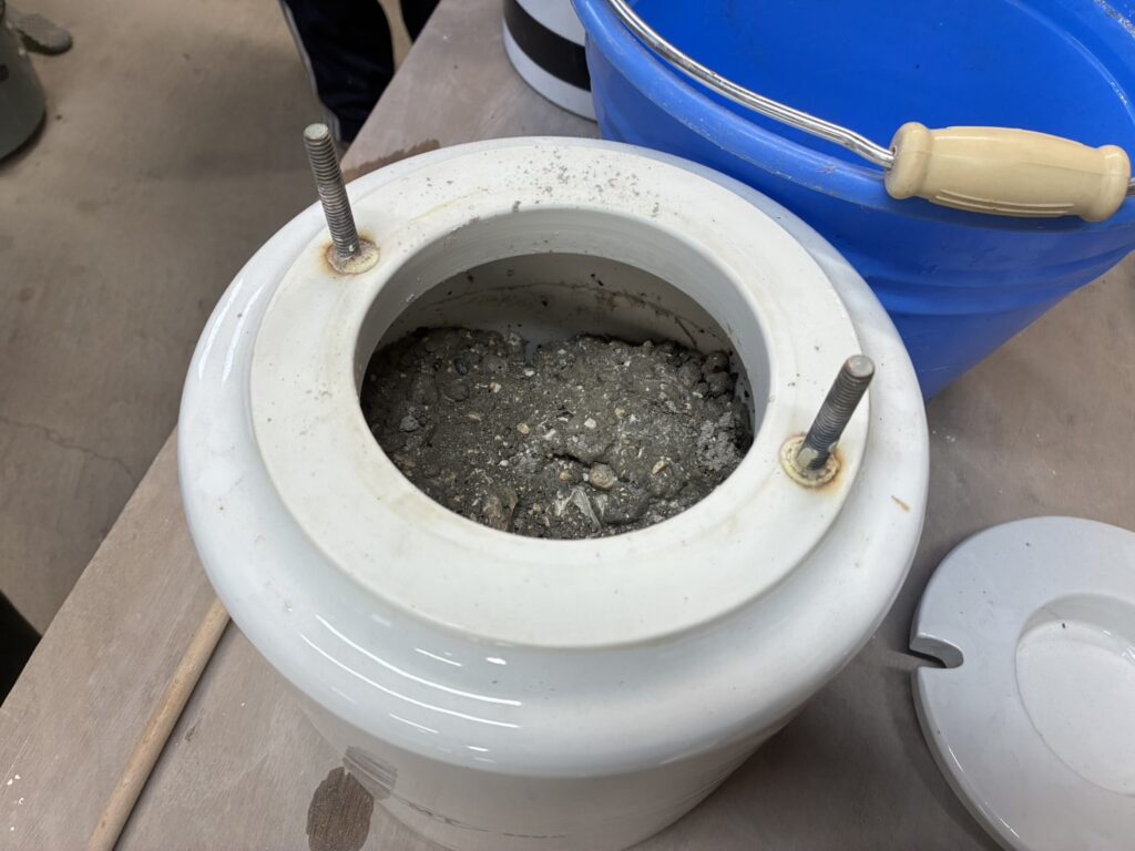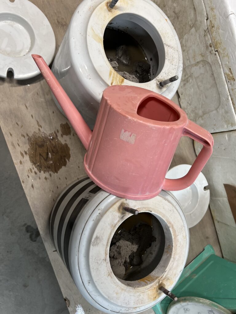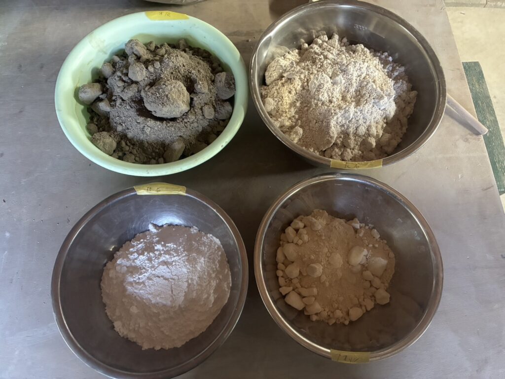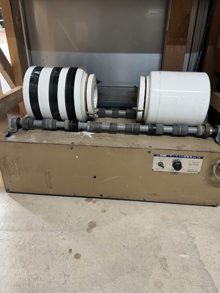 を二つのポトミルに分け、水大凡1ℓづつを入れ、4時間ぐらい擦り潰す。少し艶消し、マットな釉薬をつもりで試す事にしました。