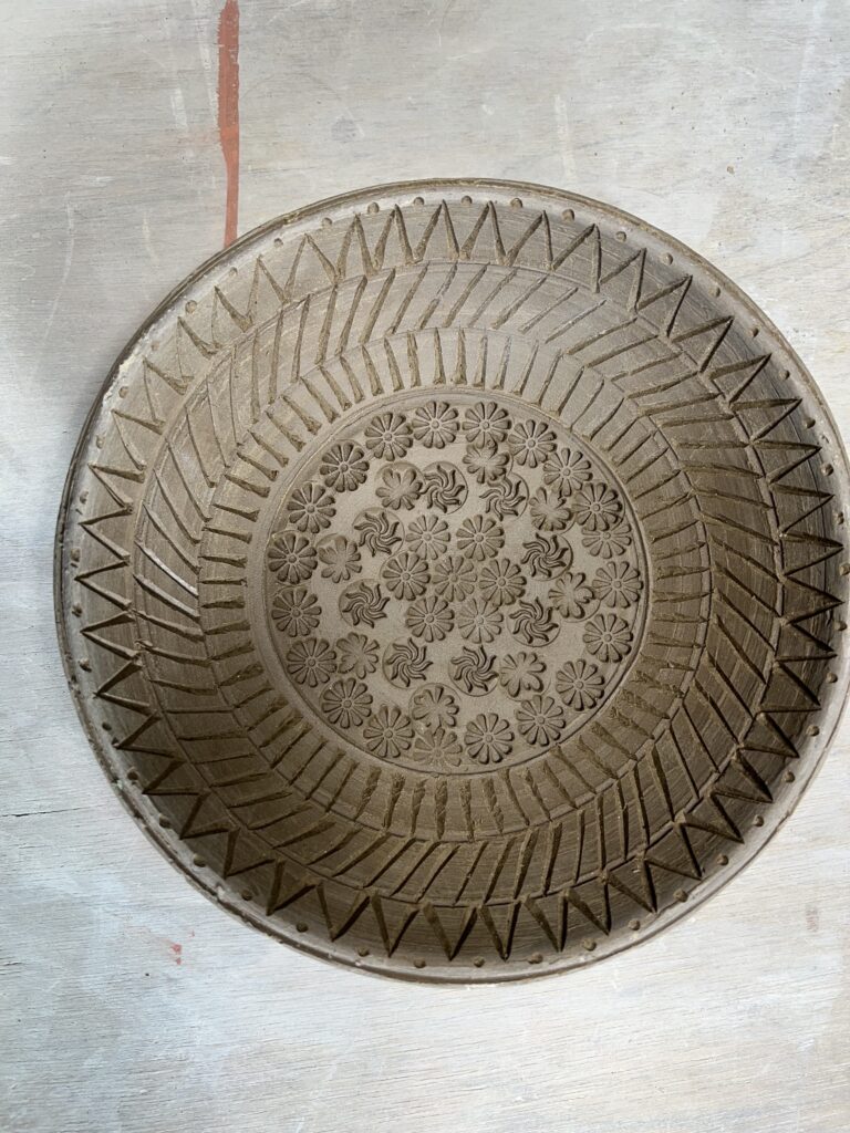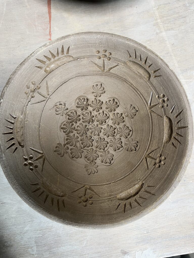最近の陶芸教室生徒の作品制作の画像です。轆轤が上手くなったので、三島手の鉢の制作を提案しました。赤土に木印と彫刻を施しその上に白化粧土を施し、掘られた部分に白化粧土が残る様に表面の余計な土を拭き取る。そしてこれを素焼きする。今の段階はここまで、後に本焼きをするが楽しみですね。