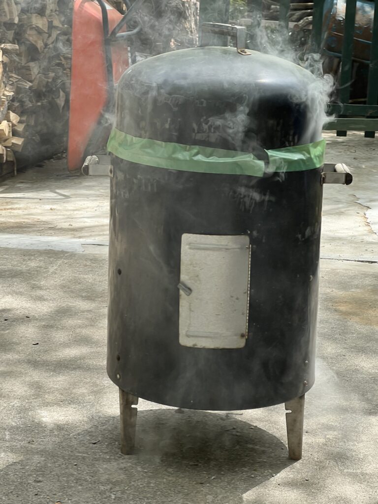 朝9時にお祭りを行い火入れをして現在までに約12時間、窯の温度は982度。還元炎で焼いています。窯の中の作品は教室の生徒の10人程の作品と私の試験的な作品です。焼成時間は明日の朝3時ごろまでの18時間を予定しています。作品の焼成具合は後日アップ致します。又本日は焼成しながら友達から頼まれたチーズの燻製も行いました。比較的良好な出来栄えでした。