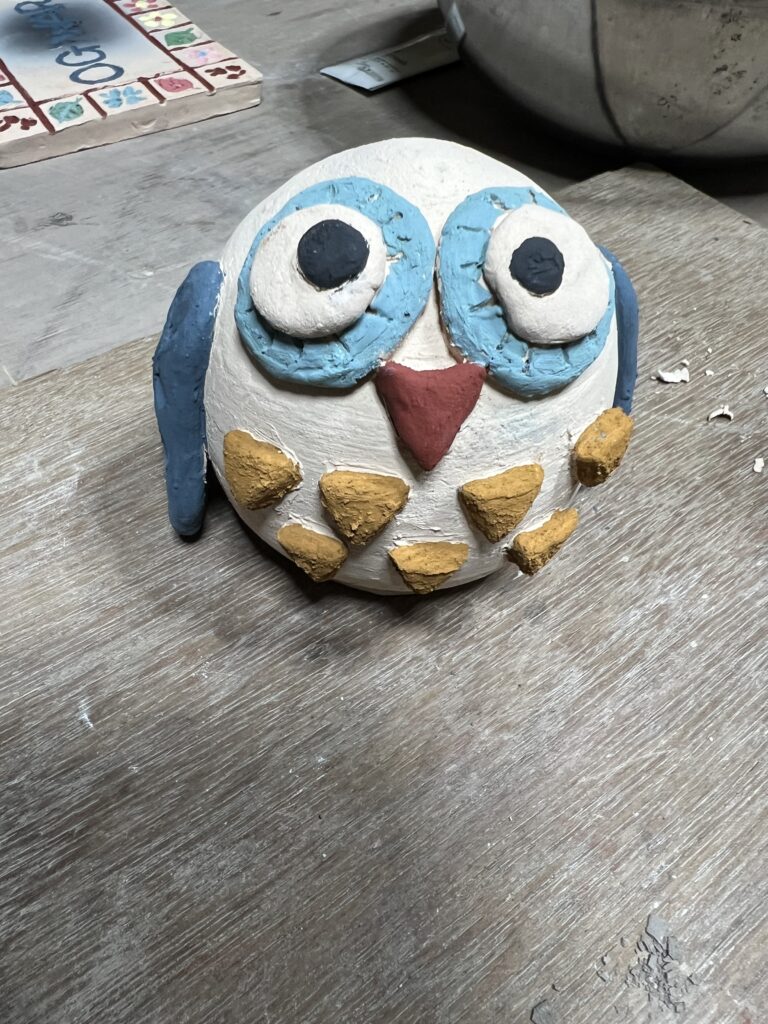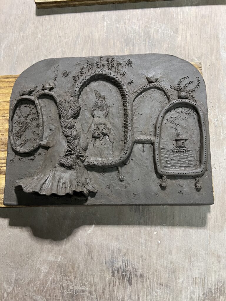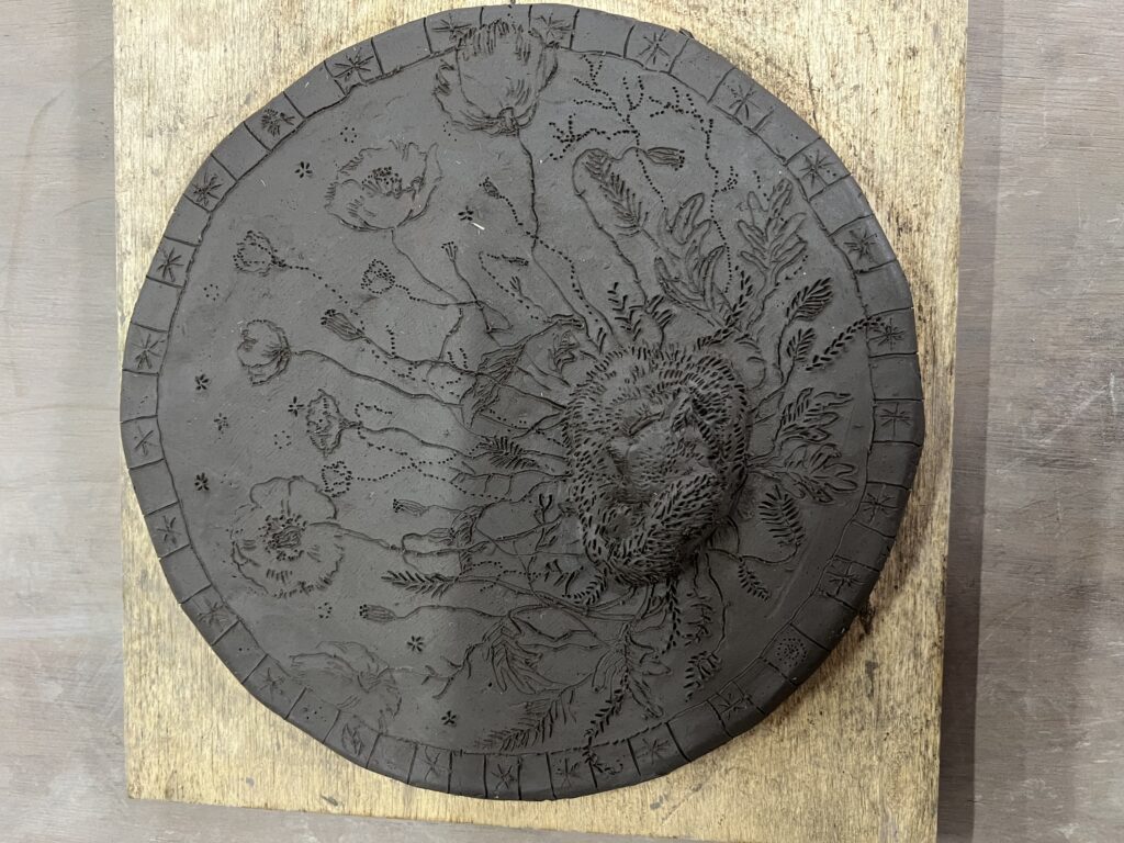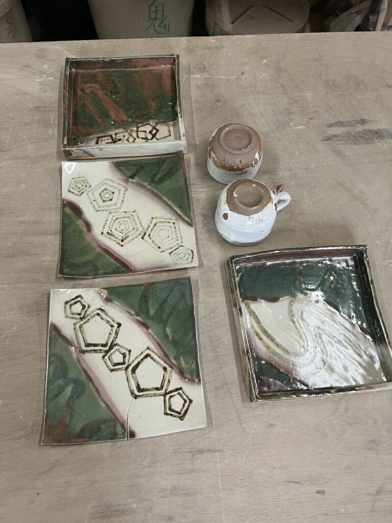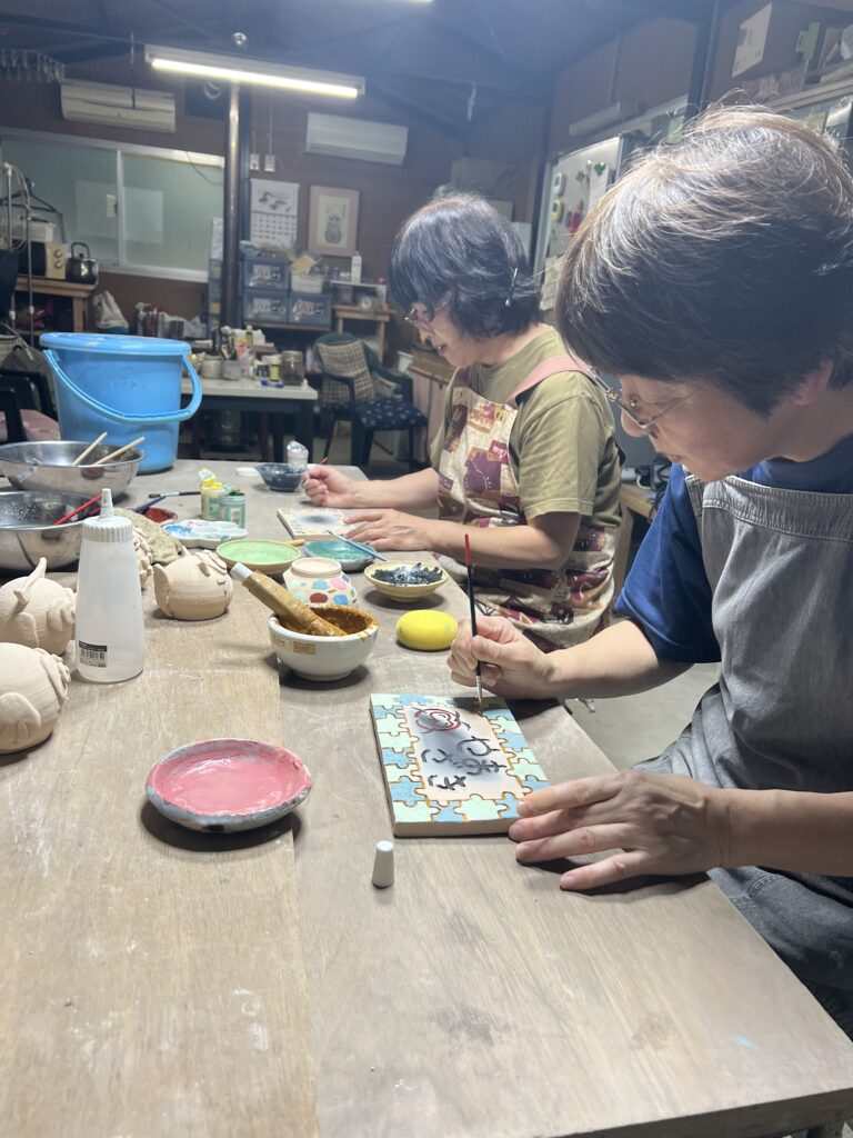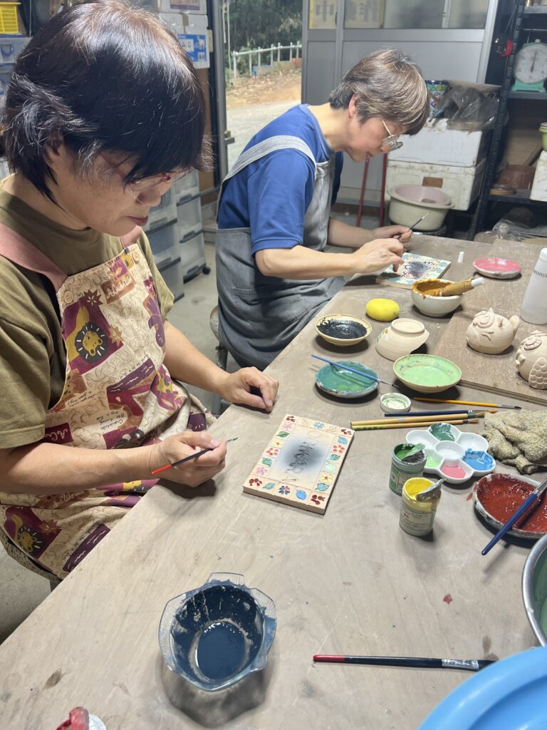 彫刻刀で陶板に様々な模様や文字を彫り、その線に様々な色を載せていく。焼き上がりが楽しみな作品です。その他魚や蛙など動物の置物も色付けを行います。焼き上がった折には又ご報告させて頂きます。