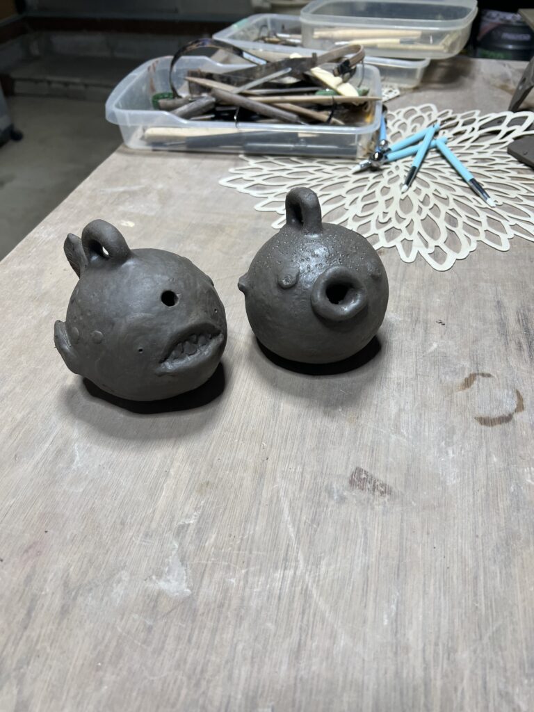 今日の午前は仲の良い夫婦が4種類の粘土を紐状にして粘土板を作りそれを角皿に仕上げました。午後は若い生徒がアンコウとフグの飾り物を使ったり、電動轆轤の練習をしました。皆さん貴重な時間を陶芸にいそしみ楽しんでいました。焼き上がりが楽しみですね。