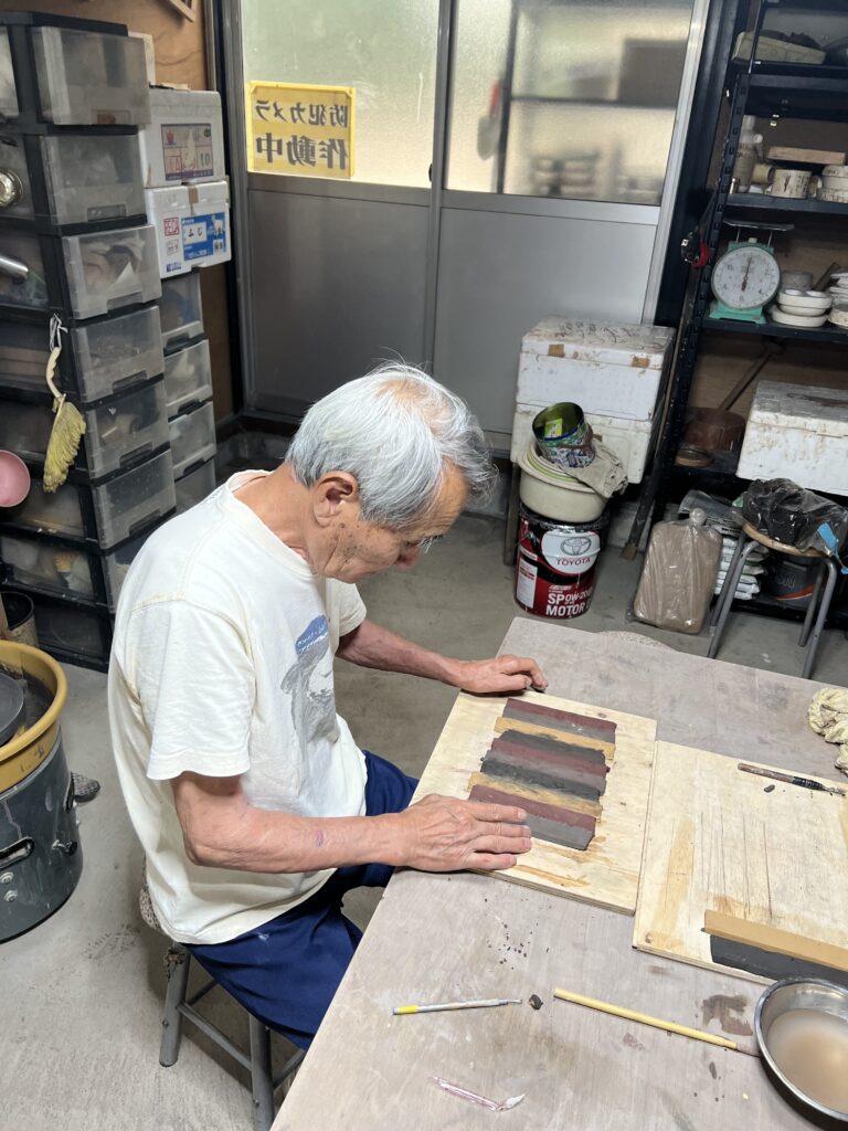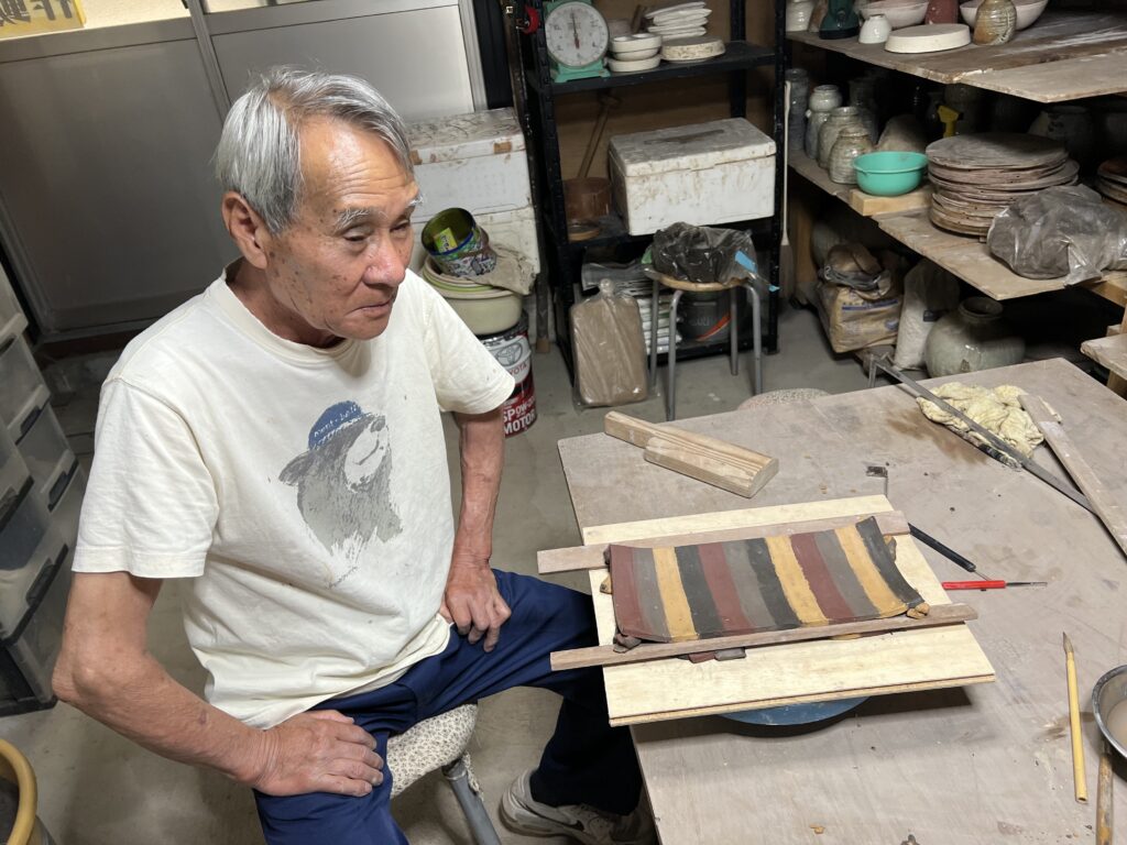 今日は会員の中の一番ご年長の方が、粉引大皿と色違い粘土を接着して長方皿を完成させました。この方は若い時に左手を怪我して指が不自由ですが、何時も前向きに取り組み今では電動轆轤もある程度挽けるようになりました。この教室に通い始めて5ヶ月が過ぎました。非常に努力家です。尊敬しています。