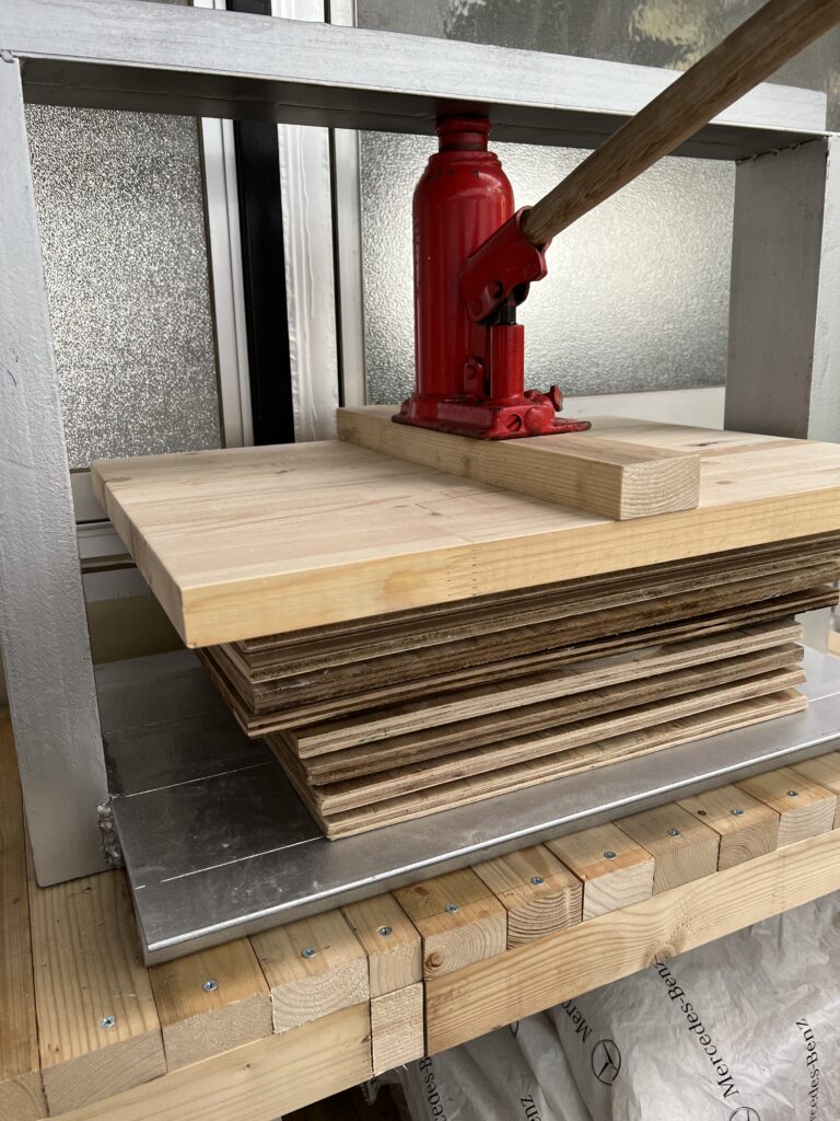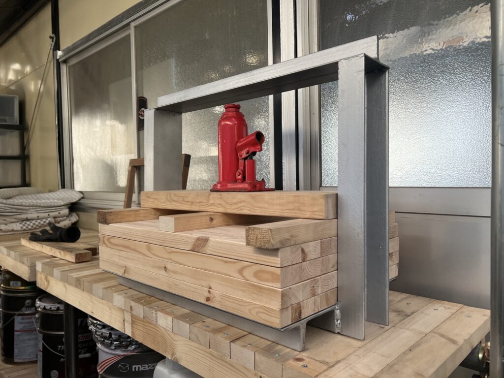 粘土板を圧力かけて締める圧力プレス機を作り試しています。タタラ板で8ミリの厚さの粘土を圧力をかけて約5ミリまで圧縮する。皿などの割れや歪みが出にくい事を期待しています。初めは石膏板で挟みましたが、乾きすぎて成形ができづらくなりましたので、木の板で挟んで圧力をかけます。上手くいって欲しいものです。仕掛けは鉄の枠をジャタッキーで締め付けるだけの簡単なもの。但しジャッキーの力が強い為鉄枠の溶接が持つかどうか、心配であります。