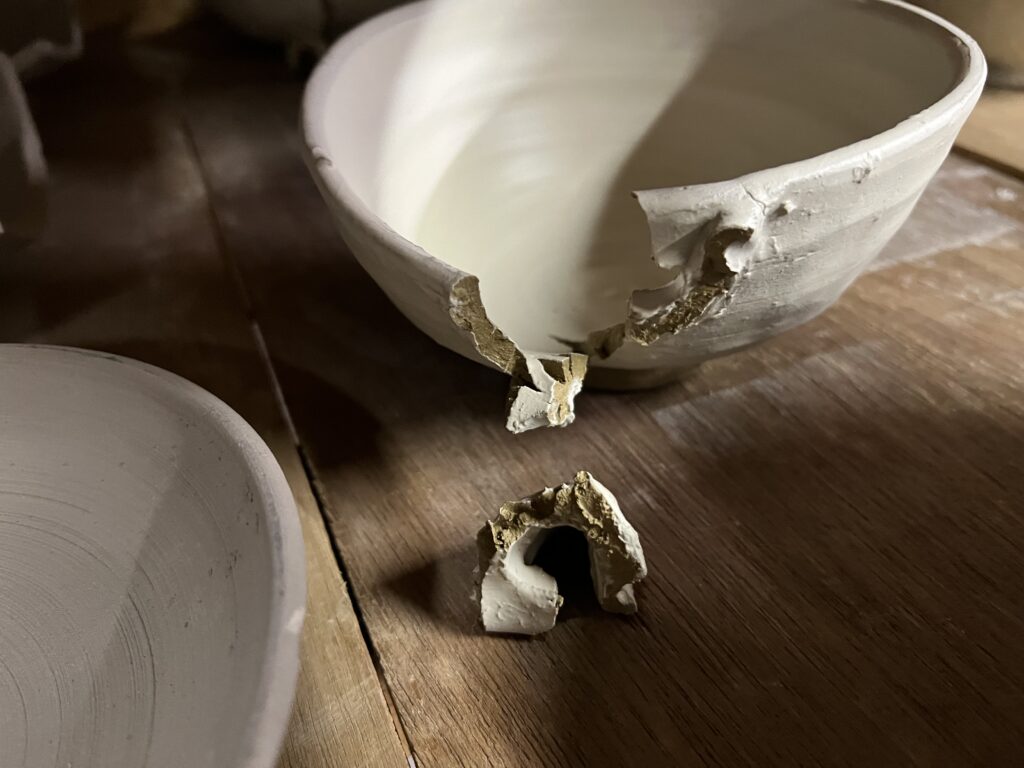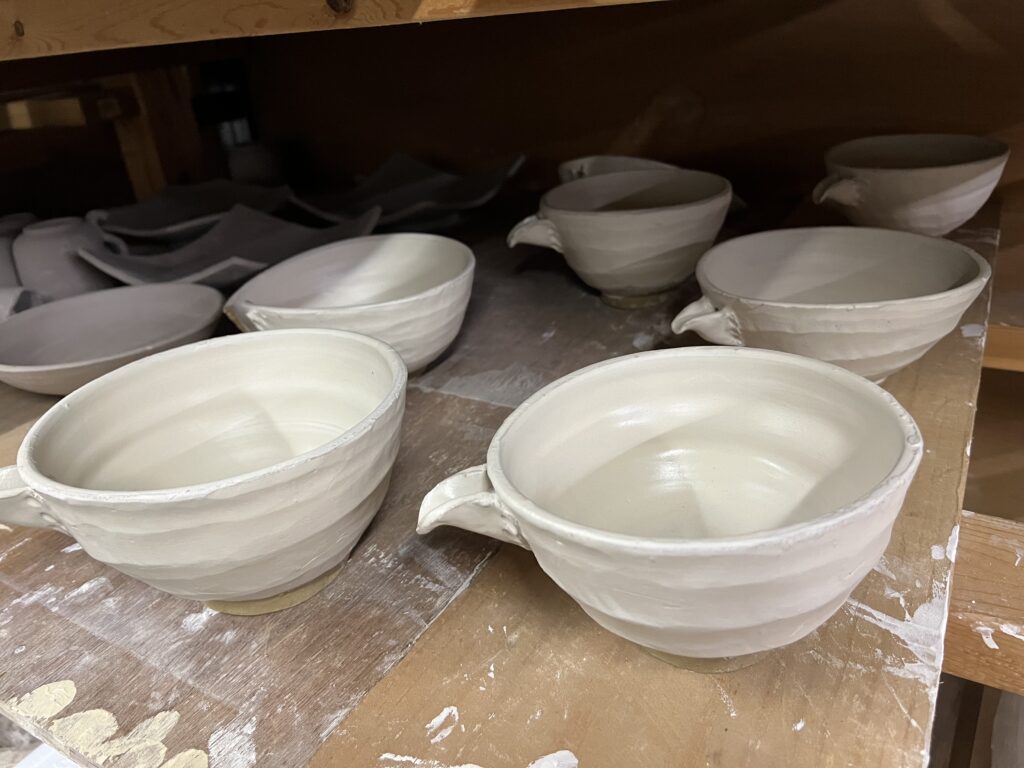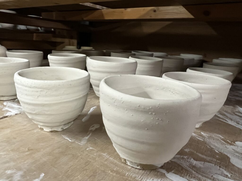 今日は粉引きについてお話しします。粉引は桃山時代より愛された焼き物で、特に侘び寂びを美の中心に置く茶道で珍重されました。その理由は非常に脆い焼き物の為、生あるもの必ず滅びる。形あるもの必ず朽ちる。と言う仏教的な哲学感により成り立つ侘び寂びにとても合致する焼き物として愛されました。粉引きが脆いのは鉄分のある土(胎土)に白い土を水で溶かしそれを施釉の様ずぶがけします。性質の異なる土を表面に水溶液で施す為、成形された粘土の器は急激に水分を吸うことになります。そこで形を保つ事が出来ずに崩れてしまいます。今回はそこのところで片口鉢は7個中二個が崩れてしまいました。失敗です。白い化粧土をずぶがけするタイミングが非常に難しい焼き物です。また焼き上がって性質が異なる土が一体化せずに白い土と胎土が剥がれてしまうこともあります。これが茶の精神では短い命、又は形あるもの必ず、いずれの日には無くなったり、崩壊する事があると言うことから、形あるもの、人の命は大事にしなければならないと言う考えになるのだと思います。茶道で茶碗なんかをマジマジと底の裏までひっくり返しながらも拝見する時は肘を畳に付けてなるべく低い姿勢で貴重な茶碗を壊さない様にしているのだと思います。以上つまらない話をしてしまいました。近いうちに教室の生徒の作品と粉引などの私の作品を焼成するつもりです。又結果をお知らせいたします。