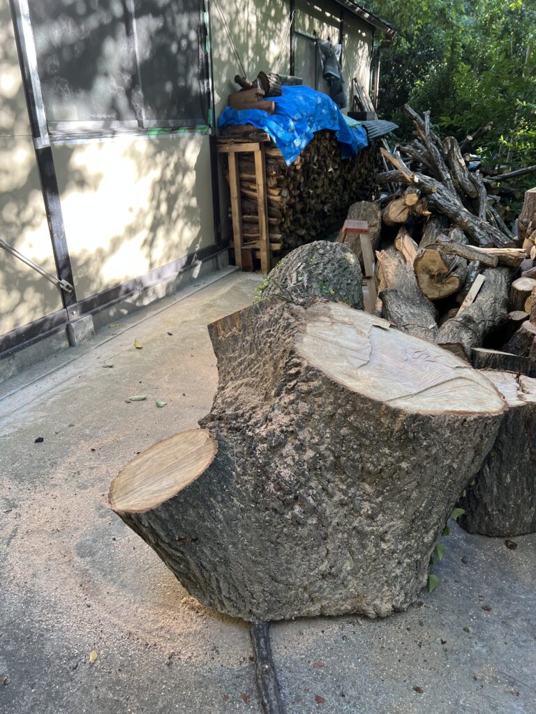 非常に大切にしていた窯場の敷地内に生えている山桜の木がついに枯れて倒れてしまいました。昨年までは本当に楽しませてくれました。根本と高い梢が腐り、ついにその命を全うしました。今日は暑い日ですがこの倒木の処理をしました。斜面で輪切りにして下まで降ろしました。非常に暑い日なので脱水症に気をつけながらの作業でした。一汗かきました。幹の部分は非常に良い状態でしたので、非常に良い薪になると思います。枯れても人間の役に立つ木に感謝です。